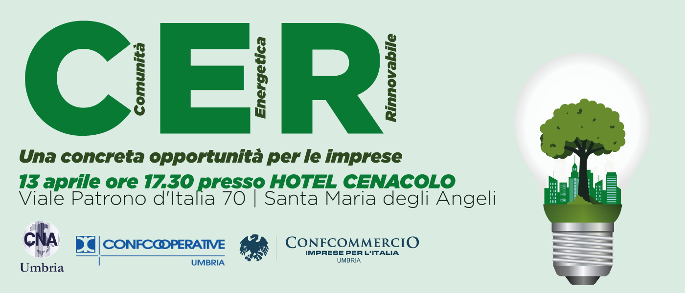 Per fare chiarezza sul tema delle CER e per fornire tutte le informazioni disponibili abbiamo organizzato insieme a Confcooperative Umbria e Confcommercio Umbria un convegno che si svolgerà nel pomeriggio di giovedì 13/04 presso l’hotel Cenacolo di S. Maria degli Angeli